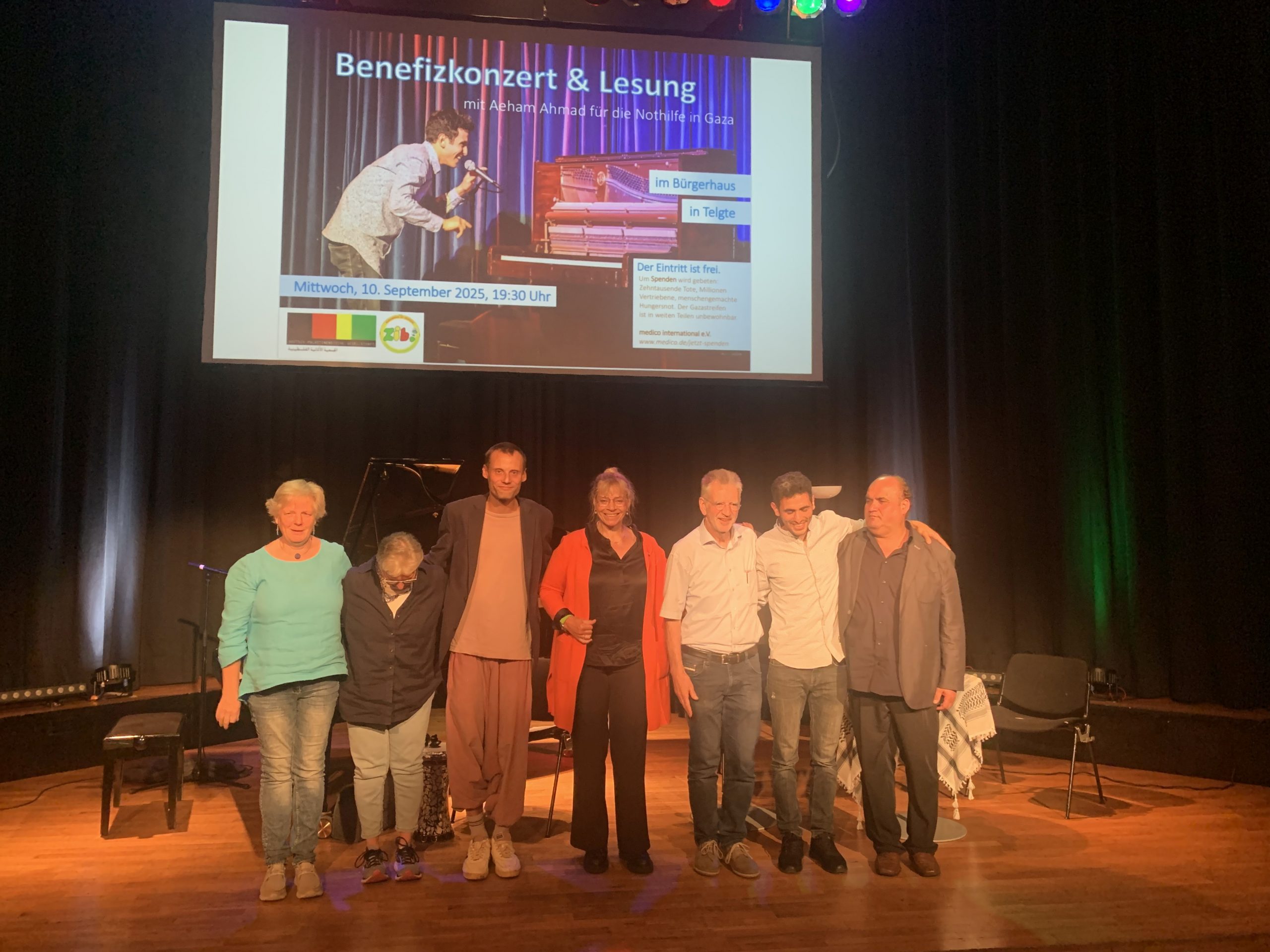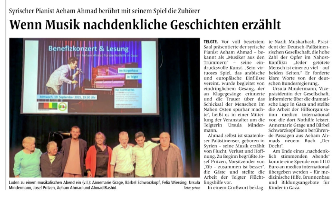 Vor voll besetztem Saal präsentierte der syrische Pianist Aeham Ahmad – bekannt als der „Musiker aus den Trümmern“ – seine eindrucksvolle Kunst. Es war ein besonderer Abend der Musik, Lesung, Begegnung und Hoffnung Mittwoch, 10 September 2025 im Bürgerhaus in Telgte.